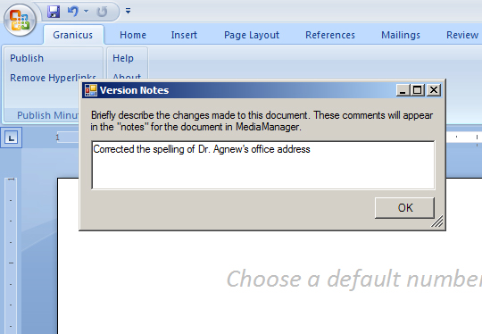 Warning! Changes made to a MS Word minutes document are displayed only in that document; the changes are not reflected within MediaManager.