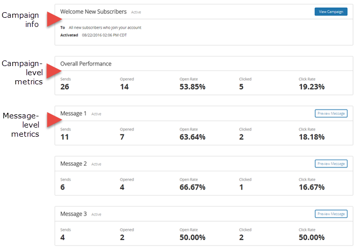 This section contains engagement metrics across all campaign messages. It tells you how many subscribers have received and engaged with the messages to-date.