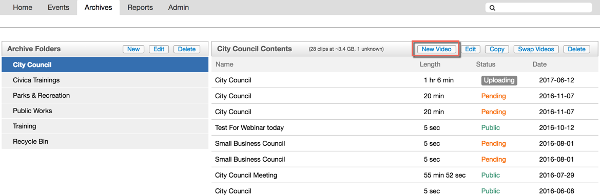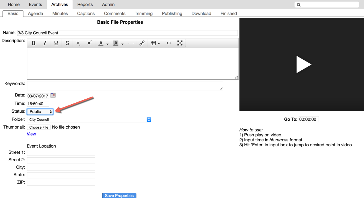 Note: If you set the status to Not Public or Pending, the archive (including the video) will be visible only to internal viewers. Use Not Public for internal-only archives and Pending for archives you wish to edit before posting to your view page.