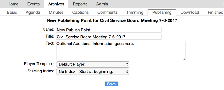 Archive Publishing Points are used to direct viewers to the video player from a recorded meeting. For this you will use the Publishing Points feature in the Archives tab.