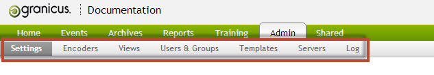 The Admin feature in MediaManager allows you to create and control users and groups, meeting encoders, and servers. Admin also allows you to view a Log report for MediaManager.