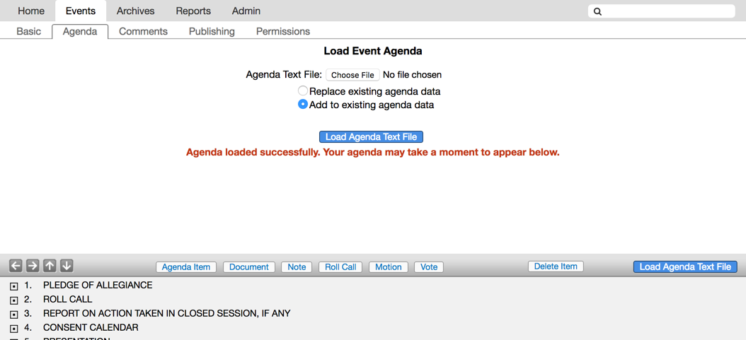 Select Replace existing agenda data or Add to existing agenda data. If there is no agenda currently loaded, leave the selection on Replace existing agenda data.