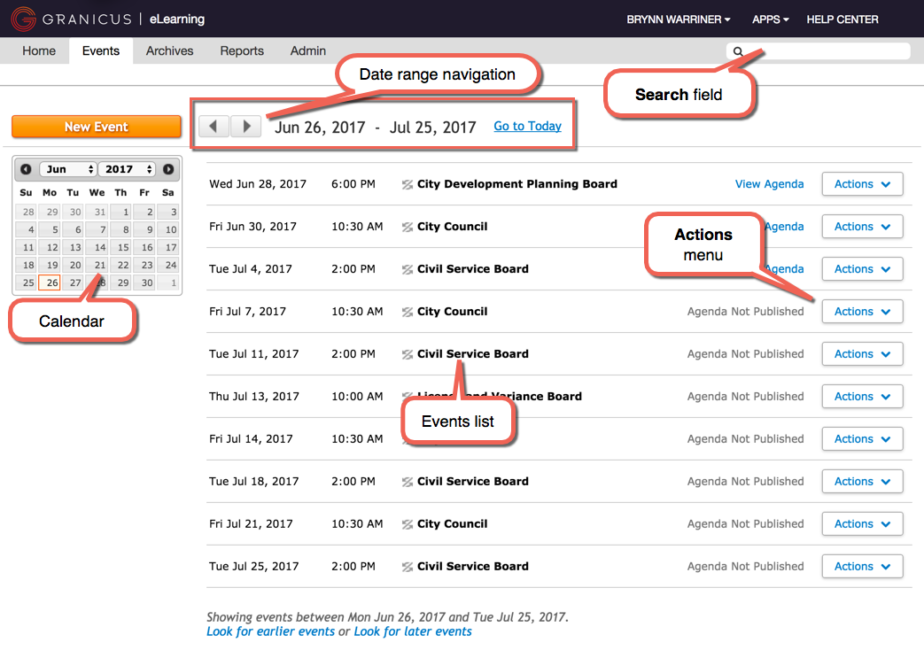 If you can't locate an event using the navigation arrows or the calendar, enter all or part of the event name in the Search field, and then press Enter or Return on your keyboard to view a list of matching events.