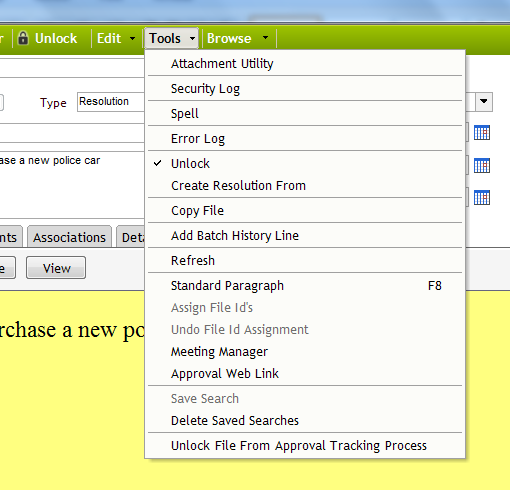 The following fields explain the different features within the Tools menu. Some of these features are exclusive to the Files module.