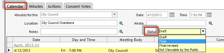 When the minutes document is generated, the status of the document is set to Draft to prevent other users from viewing the minutes until the status is manually changed to Final.