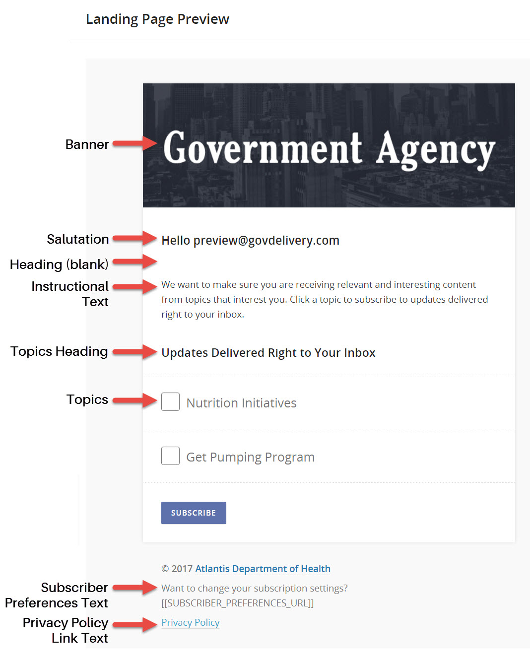 - Enter text for the privacy policy link if you want it to say something other than "Privacy Policy." This link uses the URL for your privacy policy that your Account Administrator provided to Granicus.