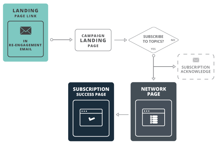 When a subscriber receives the re-engagement email and clicks on a topic to subscribe, they will be taken to the landing page you configured as part of the campaign. Following that landing page, they will see the Network page, and lastly the Success page. These pages are managed in your Subscription Page Templates.