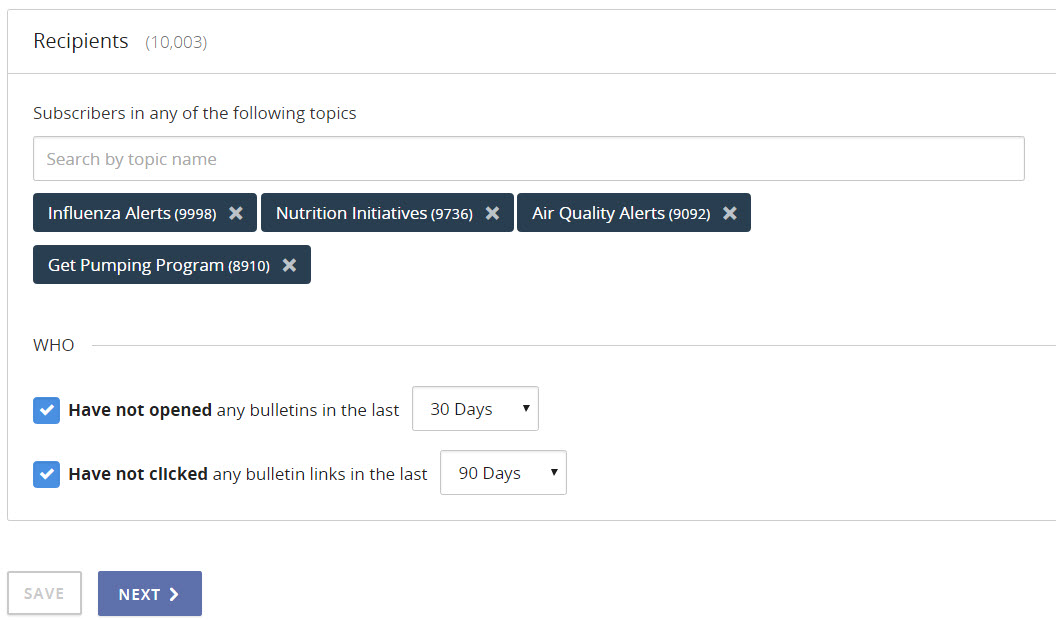 You can select which topics to target for your audience. You'll also define what "inactive" means to you, by using simple criteria options to set the length of time that must have elapsed since the subscribers last opened or clicked an email.