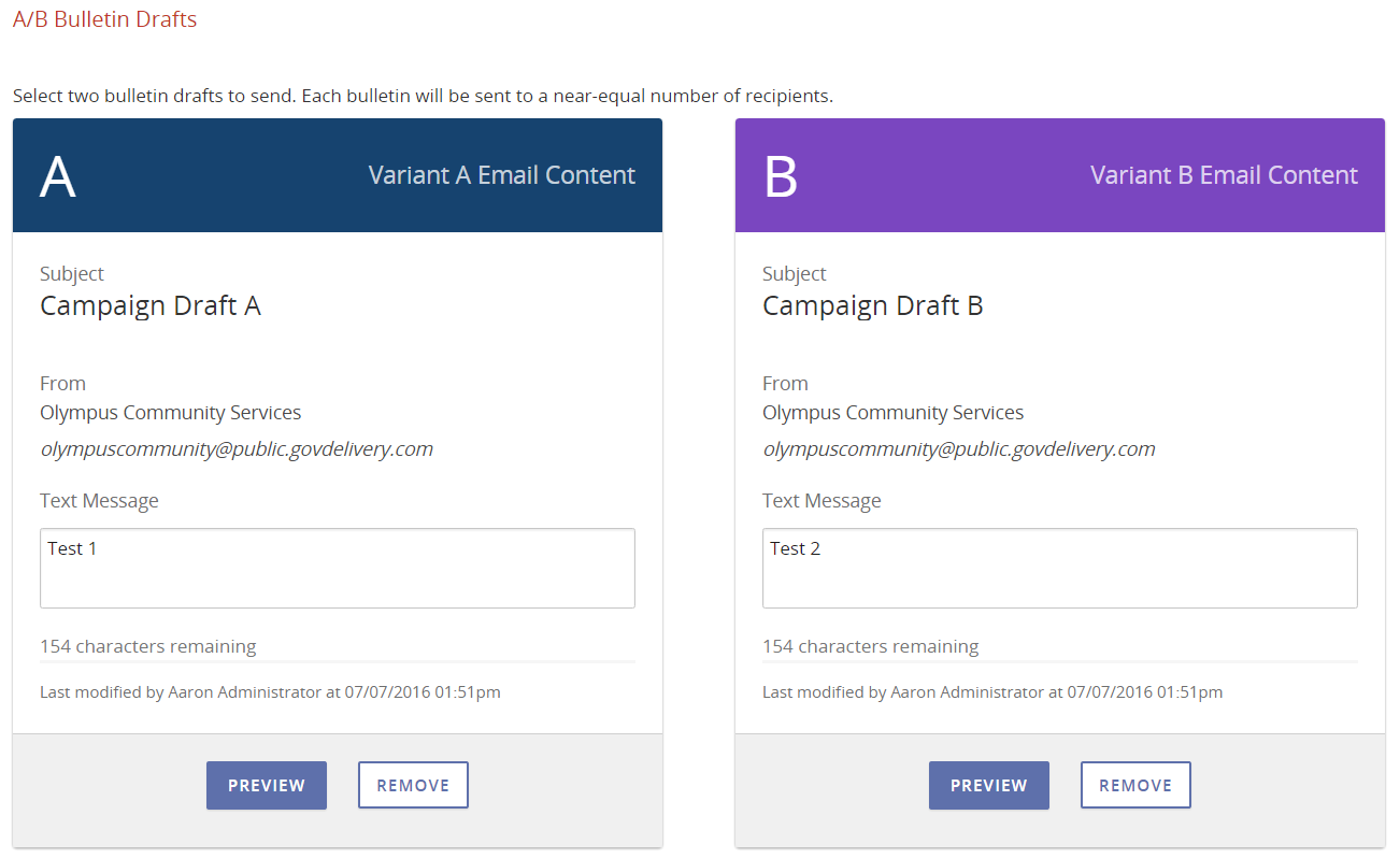 Make sure you have already created the bulletins you want to use as your campaign messages. You can only select bulletins that are currently in draft form as your testing campaign messages. See the Analyzing A/B Testing Campaigns article for tips on creating bulletins for testing campaigns.