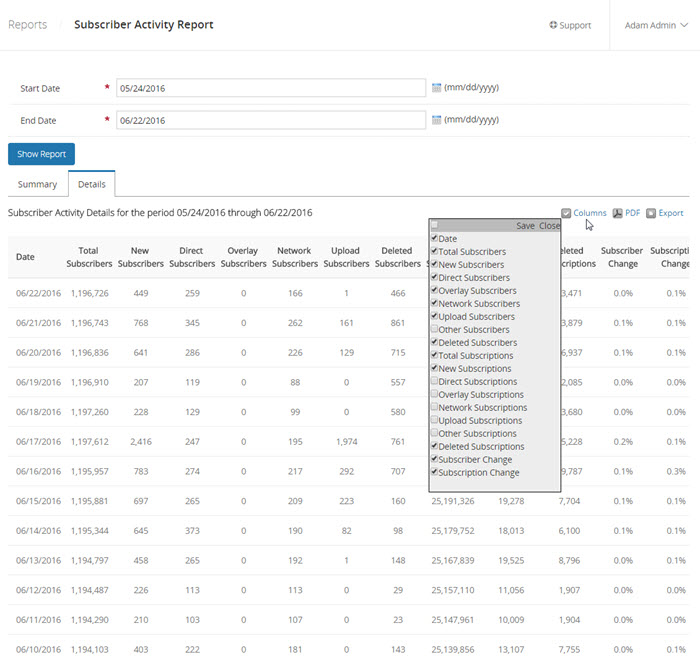 The Details view provides a daily snapshot of all of the data metrics from the Summary view and also includes columns for both subscriber and subscription percentage growth per day. The check mark in the top right corner of the Details view allows you to activate or deactivate specific columns to meet your preferences and the needs of your agency.