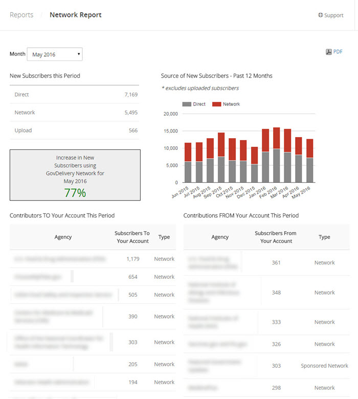 If you participate in the govDelivery Network, you can view the impact of your partnerships in the Network Report. This report details how many new subscribers you receive each month from your govDelivery Network partners, allowing you track your successes and overall metrics