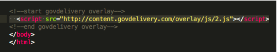 After requesting your overlay, Granicus will email your organization your custom one-line script tag to embed on your website. You will need to add this snippet of script to each page of your website that you want your overlay to appear on. The script tag will look similar to this: