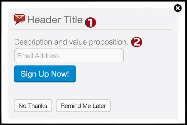 The header title is found at the top of your overlay, and should tell your website visitors why they're seeing an overlay. Use phrases like, "Sign Up For Email Updates" or "Don't Miss Out!" to give potential subscribers context around your prompt.