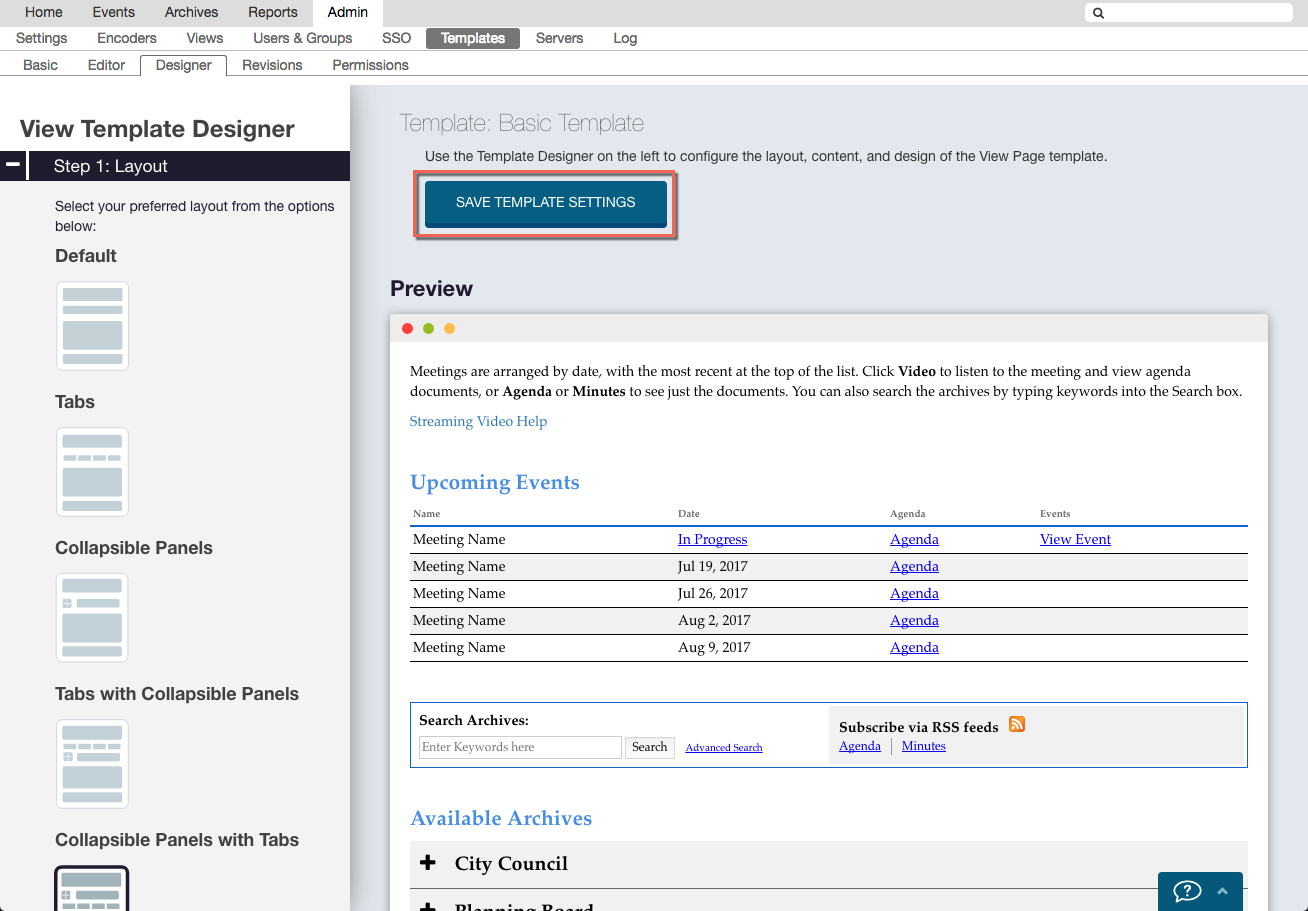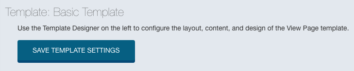 5. Click the Designer tab. The View Template Designer loads with the default layout and design. Make changes in the Layout, Content, and Design sections (see below), then scroll back to the top of the preview pane and click Save Template Settings. Your changes will not be applied until you click this button, and if you navigate away from the page before saving, all changes will be lost.