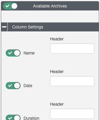 4. Available Archives works the same way as the Upcoming Events section. Use the toggle to disable available archives if you do not want them to display on the view page, and click Column Settings to hide columns or edit column headers.