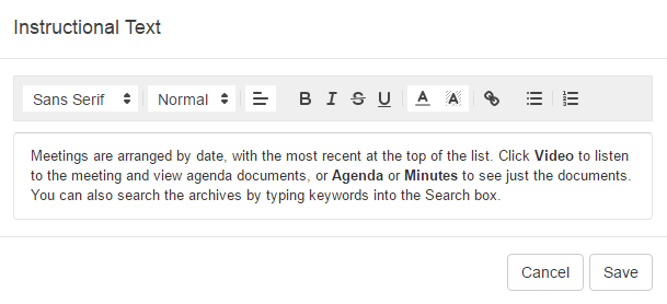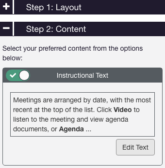 1. Click the Content header to see the content options. The first is the Instructional Text editor. This enables you to change or hide the text that displays at the top of the view page above the meetings. Use the toggle switch to display or hide the text. Click the Edit Text button to change the text from the default.