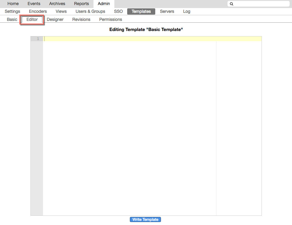 4. If you're editing an existing view template, click the Editor tab in the third-level menu to ensure that the Editing Template field is empty. The presence of HTML content in the field will disable the designer.